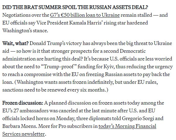 Видання повідомляє, що переговори про виділення Україні 50 мільярдів євро від країн G7 зайшли в глухий кут через позицію США. Через зростаючий рейтинг Камали Харріс Білий дім уже менше стурбований загрозою повернення Дональда Трампа і не поспішає домовлятися з Євросоюзом про використання заморожених російських активів.