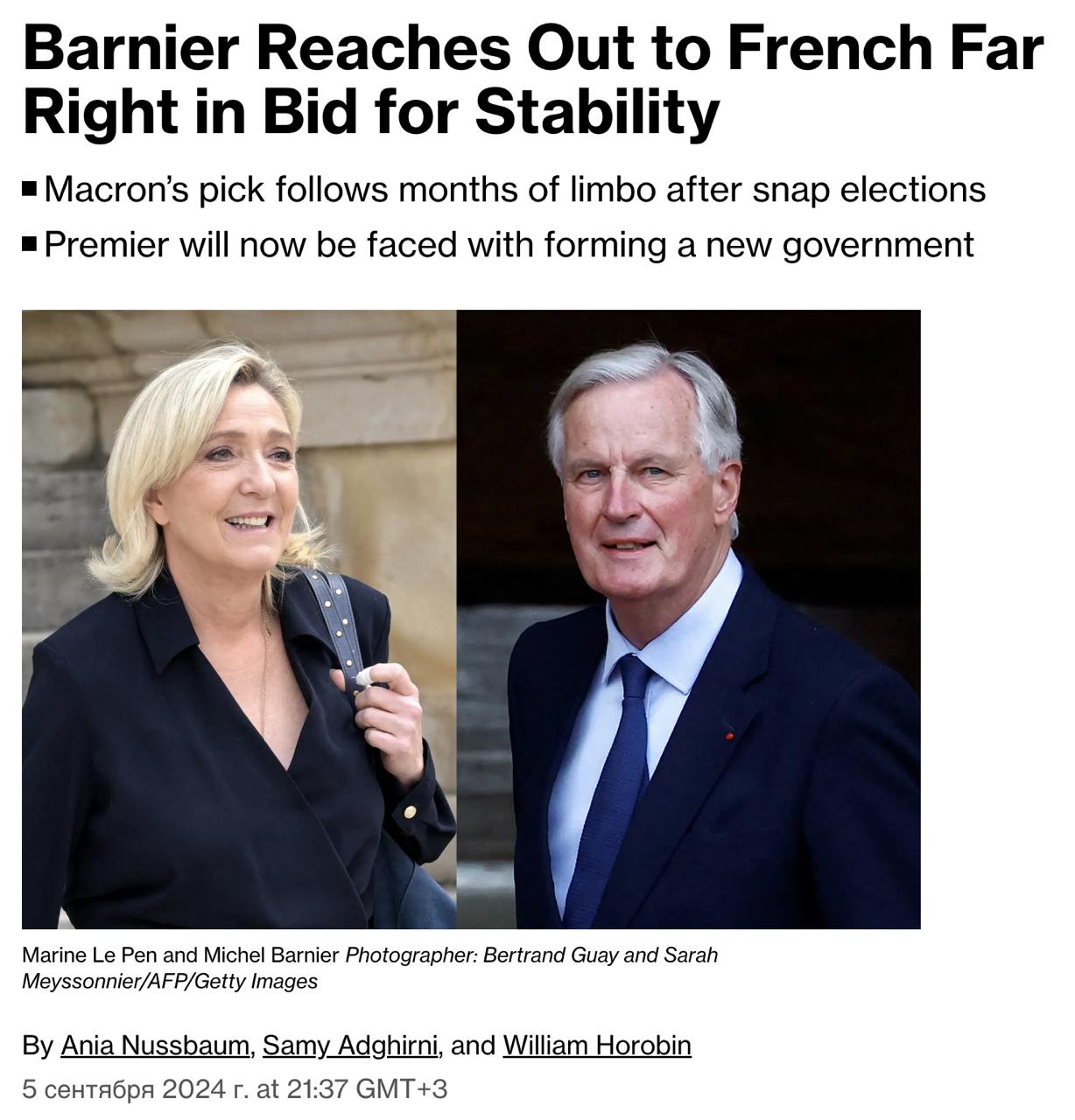 Але найцікавіше, що Барньє тепер має намір спиратися на підтримку в парламенті... партії Ле Пен (з якою всі на виборах дружно воювали на чолі з Макроном), просуваючи її ідеї, пише Bloomberg.