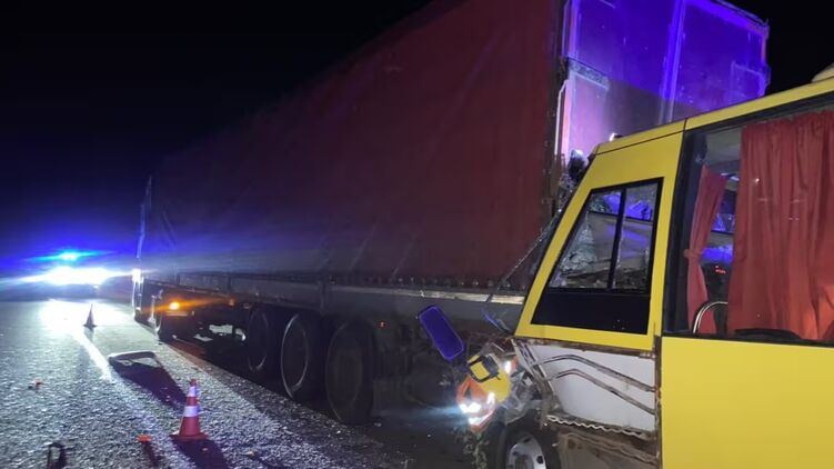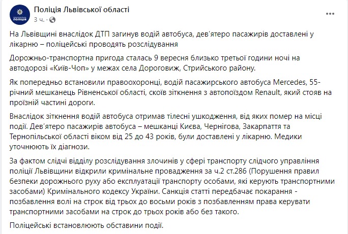 Також про аварію розповіла поліція. Як встановили правоохоронці, водій пасажирського автобуса Mercedes, 55-річний житель Рівненської області, зіткнувся з автопоїздом Renault, що стояв на проїжджій частині дороги. Внаслідок зіткнення водій автобуса отримав тілесні ушкодження, від яких помер на місці події. Дев'ять пасажирів автобуса – мешканців Києва, Чернігова, Закарпаття та Тернопільської області віком від 25 до 43 років – було доставлено до лікарні. Медики уточнюють їхні діагнози.