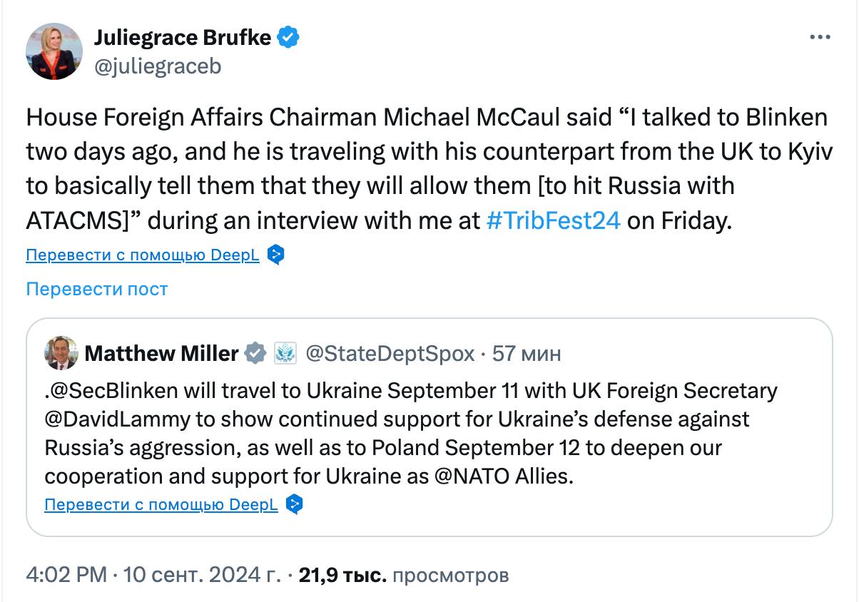 Голова Державного департаменту США Ентоні Блінкен та його колега, голова МЗС Великої Британії Девід Леммі їдуть до Києва 11 вересня, щоб озвучити дозвіл на далекобійні удари по території Росії.