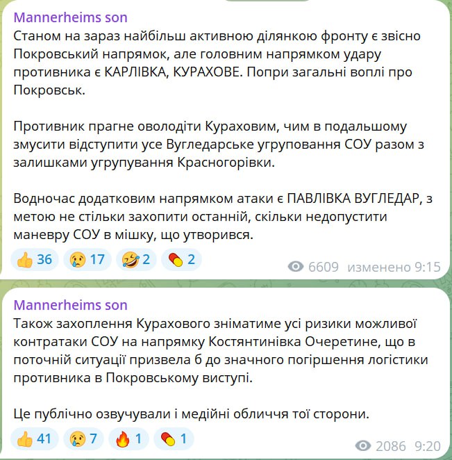 "Станом на сьогоднішній день найбільш активною ділянкою фронту є Покровський напрямок, але головним напрямом удару противника є Карлівка-Курахове. Незважаючи на загальні крики про Покровськ. ) разом із залишками угруповання Красногорівки. У той же час додатковим напрямком атаки є Павлівка, Вугледар, з метою не стільки захопити останній, скільки недопустити маневр СОУ в мішку, що утворився», – написав військовий.