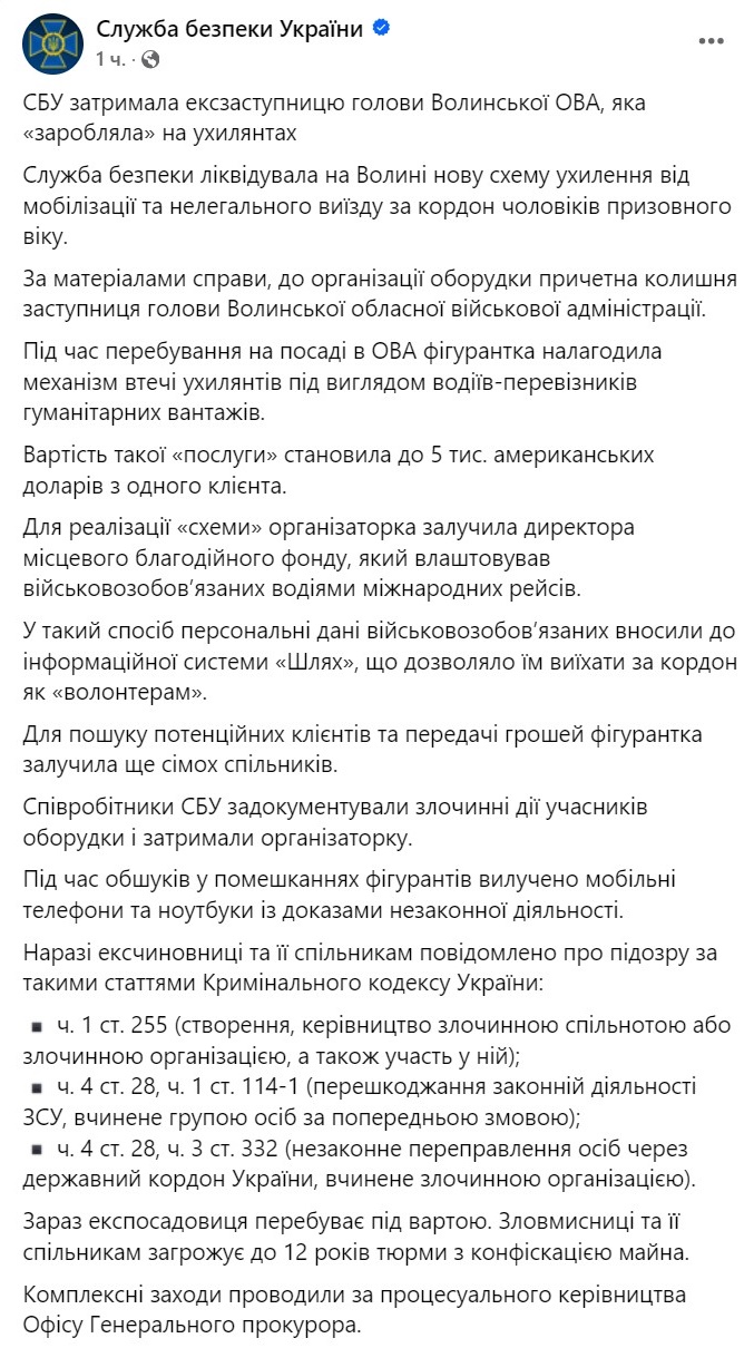 За даними слідства, на посаді в ОВА за 5 тисяч доларів вона сприяла внесенню чоловіків у систему "Шлях" для виїзду за кордон під виглядом водіїв-перевізників гуманітарних вантажів у благодійному фонді.