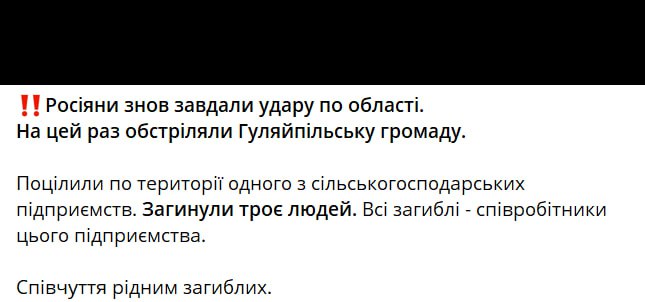 18:20 Троє людей загинули внаслідок удару по Гуляйпільській громаді.