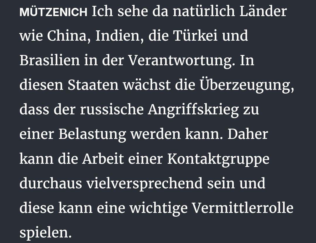 "Федеральний канцлер і президент України Володимир Зеленський згодні з тим, що зараз підходящий момент для активізації зусиль щодо проведення мирних переговорів, і що на наступному мирному саміті Росія також має бути присутньою. Я це однозначно вітаю. Це також дає іншим країнам можливість активніше брати участь у припиненні бойових дій. На мій погляд, настав час для західних союзників ініціювати контактну групу, щоби запустити цей процес", - сказав Мютценіх в інтерв'ю газеті Rheinische Post.