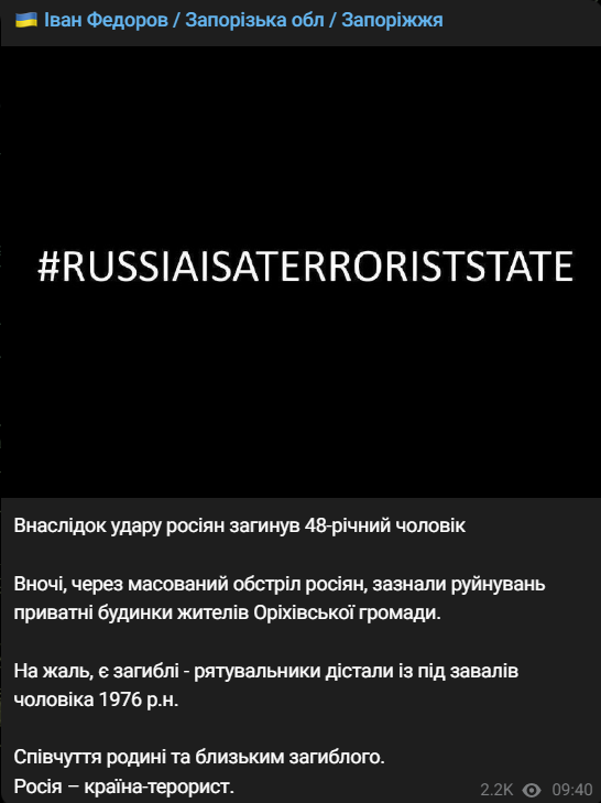 "Вночі, через масований обстріл росіян, пошкоджено приватні будинки мешканців Оріхівської громади. На жаль, є загиблі - рятувальники дістали з-під завалів чоловіка 1976 р.н.", - написав він.