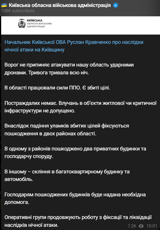 11:00 На Київщині внаслідок падіння уламків збитих "Шахедів" є пошкодження у двох районах. Про це повідомляє голова Київської ОВР Руслан Кравченко.