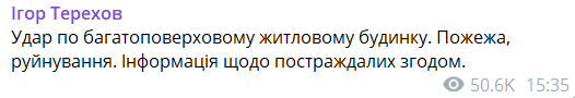"Удар по багатоповерховому житловому будинку. Пожежа, руйнація. Інформація про постраждалих згодом", - написав він.