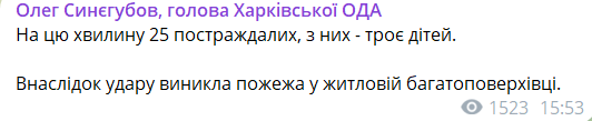 "На цю хвилину 25 постраждалих, з них - троє дітей. Внаслідок удару виникла пожежа в житловій багатоповерхівці", - повідомив Синєгубов.
