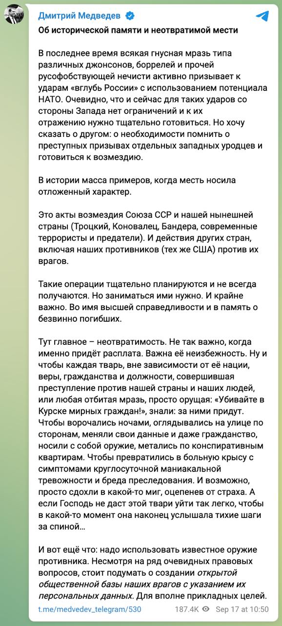 У тому ж посту він погрожував усім "ворогам Росії" "неминучою розплатою". Вони мають знати – "за ними прийдуть", написав Медведєв.