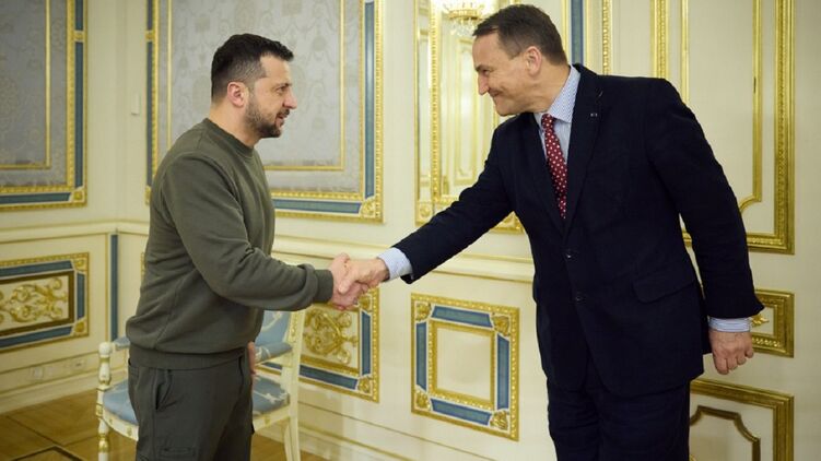 Президент України Володимир Зеленський зустрівся з міністром закордонних справ Польщі Радославом Сікорським у п'ятницю у Києві.