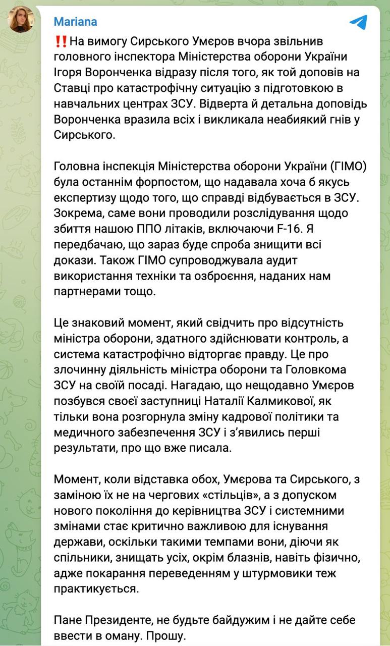 Вона пише, що вчора "на вимогу Сирського" Умеров звільнив головного інспектора Міноборони Ігоря Воронченка.