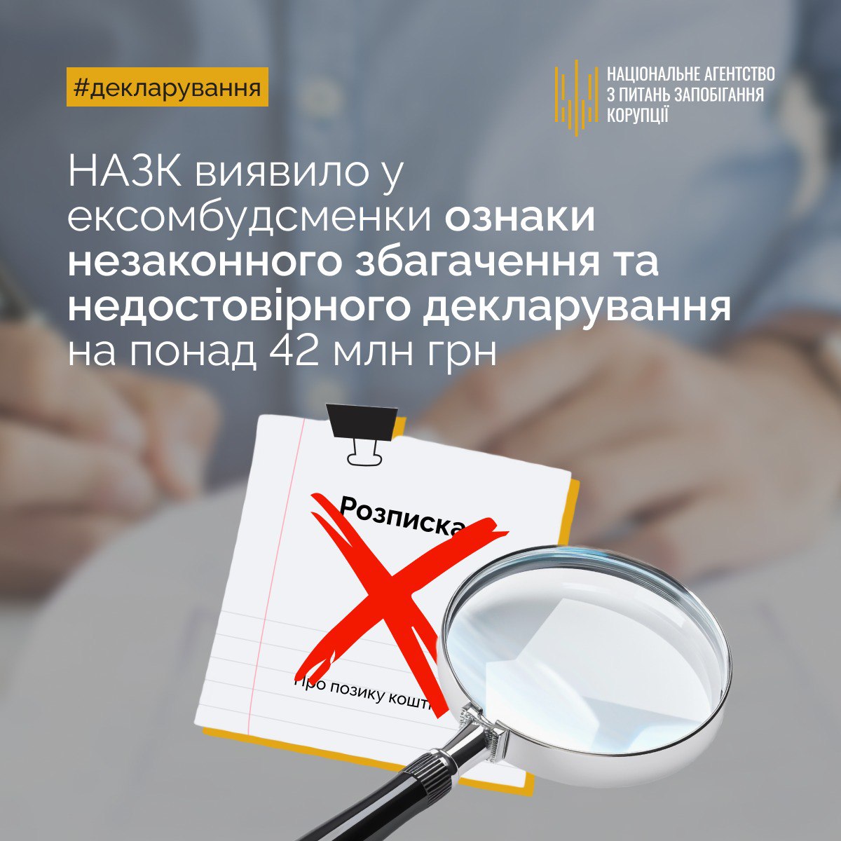 Національне агентство з питань запобігання корупції (НАЗК) знайшло ознаки незаконного збагачення у деклараціях колишнього омбудсмена Людмили Денисової.