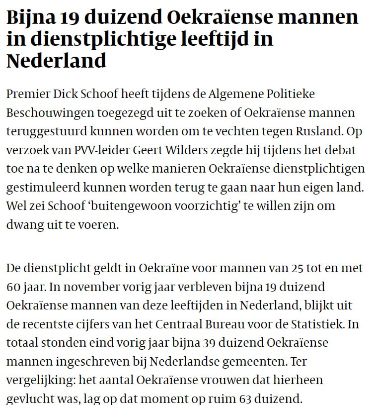 Прем'єр-міністр Нідерландів Дік Схоф пообіцяв з'ясувати, як можна змусити українських чоловіків призовного віку, які втекли до Нідерландів, повернутися до України.