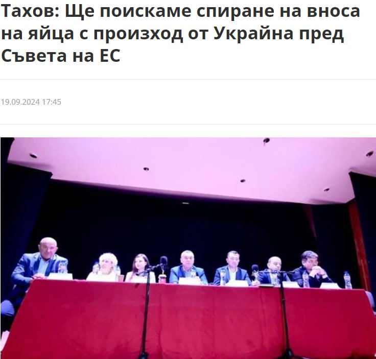"Коли імпорт певного виду продукції чи товару – овочів, м'яса, яєць – досягає певних лімітів, які Єврокомісія окреслила заздалегідь, тоді ми можемо активувати механізм заборони їхнього імпорту. Зараз ми робимо це з погляду яєць", – пояснив міністр Тахов, додавши, що вони вже включені до переліку товарів з підвищеним митом і робиться наступний крок, оскільки він вимагатиме їхньої абсолютної заборони на засіданні Ради ЄС.