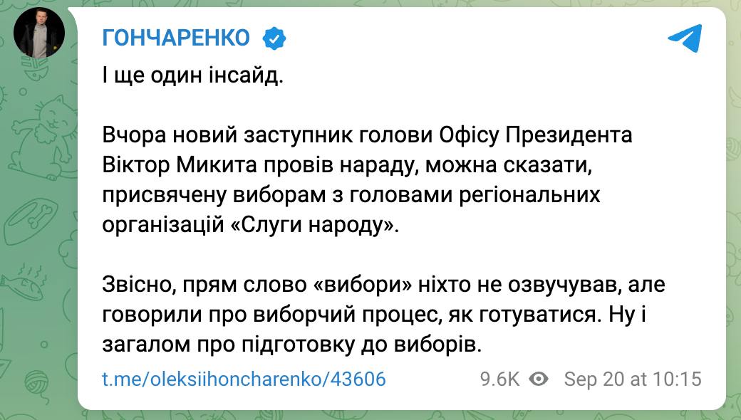 "Звичайно, прямо слово "вибори" ніхто не озвучував, але говорили про виборчий процес, як готуватись. Ну і взагалі про підготовку до виборів", - пише Гончаренко.