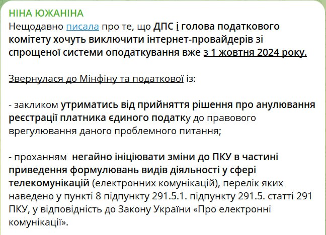 Вона заявила, що з 1 жовтня провайдерів хочуть вивести зі спрощеної схеми оподаткування.