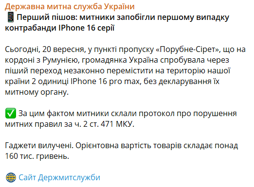 На кордоні з Румунією зафіксовано перший випадок контрабанди , представлених компанією Apple, нових iPhone 16.