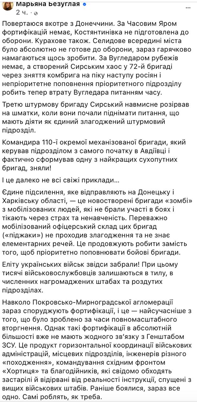 "Повертаюся ще раз із Донеччини. За Вартовим Яром фортифікацій немає, Костянтинівка не готова до оборони. Курахове теж. Селидове всередині міста було зовсім не готове до оборони, зараз гарячково намагаються щось зробити. За Вугледаром кордонів немає, а створений Сирським (головком) хаос у 72-й бригаді через зняття комбрига на піку наступу росіян і непріоритетного поповнення пріоритетного підрозділу робить тепер втрату Вугледара питанням часу", - написала вона.