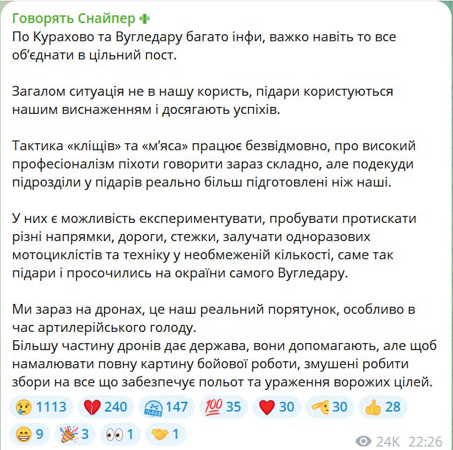 За його словами, ситуація щодо Курахового та Вугледару не на користь ЗСУ, оскільки російські війська "користуються нашим виснаженням і досягають успіхів".