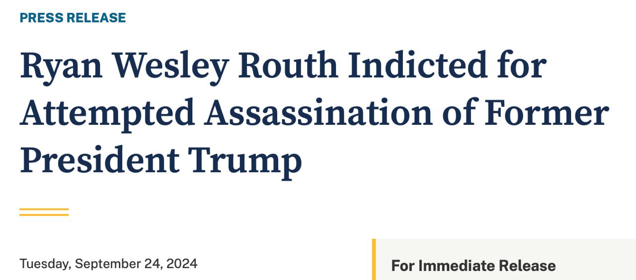 "Колишній президент Трамп грав у гольф у Trump International 15 вересня, і агент Секретної служби, який проводив зачистку периметра, побачив частково приховане обличчя людини, пізніше ідентифікованої як Рут, у кущах уздовж лінії паркану біля шостої лунки. Агент спостерігав за стволом гвинтівки, спрямованим прямо на нього. Коли агент почав відступати, він побачив, як ствол гвинтівки рухається, і агент вистрілив у Рута.