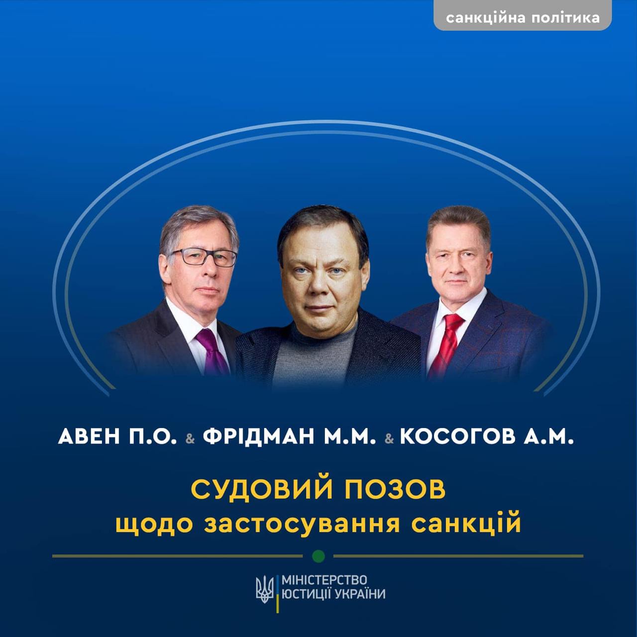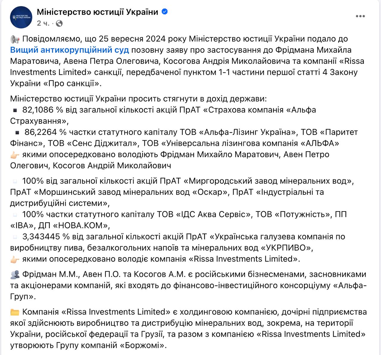 Мін'юст попросив Вищий антикорупційний суд стягнути у дохід держави українські активи російських бізнесменів. Крім Фрідмана, це також Петро Авен та Андрій Косогов. Йдеться про такі підприємства: