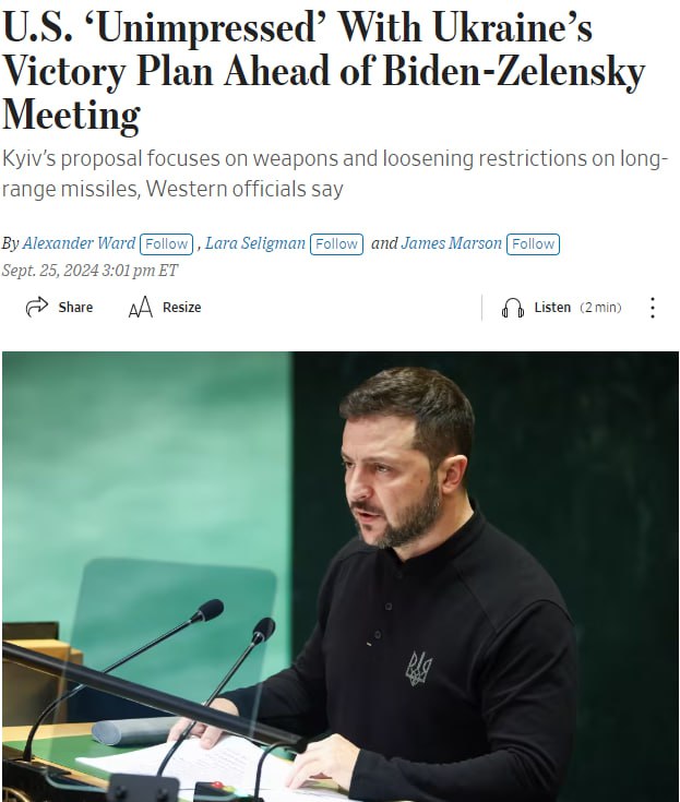 За даними видання, адміністрація Байдена стурбована тим, що план українського президента щодо перемоги у військовому конфлікті проти Росії не має всеосяжної стратегії і є не більш ніж "переупакованим проханням" про надання більшої кількості зброї та зняття обмежень на ракети далекого радіусу дії, заявили WSJ американські урядовці.
