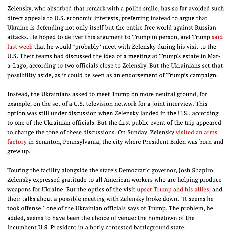 "Цей варіант досі обговорювався, коли Зеленський приземлився в США, за словами одного з українських чиновників. Але перший публічний захід поїздки, схоже, змінив тон цих обговорень", - пише журналіст.