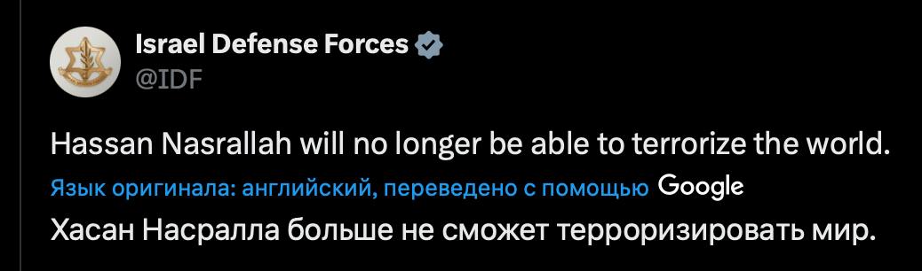 "Хасан Насралла більше не зможе тероризувати світ", - йдеться на сторінці армії у Х.