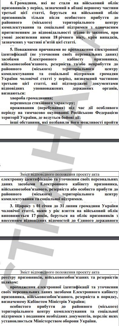 Згідно з текстом проекту, з 1 січня до 31 липня громадяни, яким у рік взяття на облік виповнюється 17 років, мають пройти електронну ідентифікацію персональних даних в Електронному кабінеті призовника, військовозобов'язаного, резервіста. Або особисто з'явитися до ТЦК із переліком документів, встановлених Міноборони.