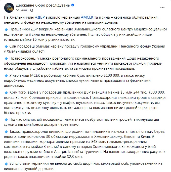 Державне бюро розслідувань викрило керівницю Хмельницького обласного центру медико-соціальної експертизи (МСЕК) та її сина, керівника облуправління Пенсійного фонду на незаконному збагаченні на мільйони доларів. Родичі заробили статки на ухилянтах.