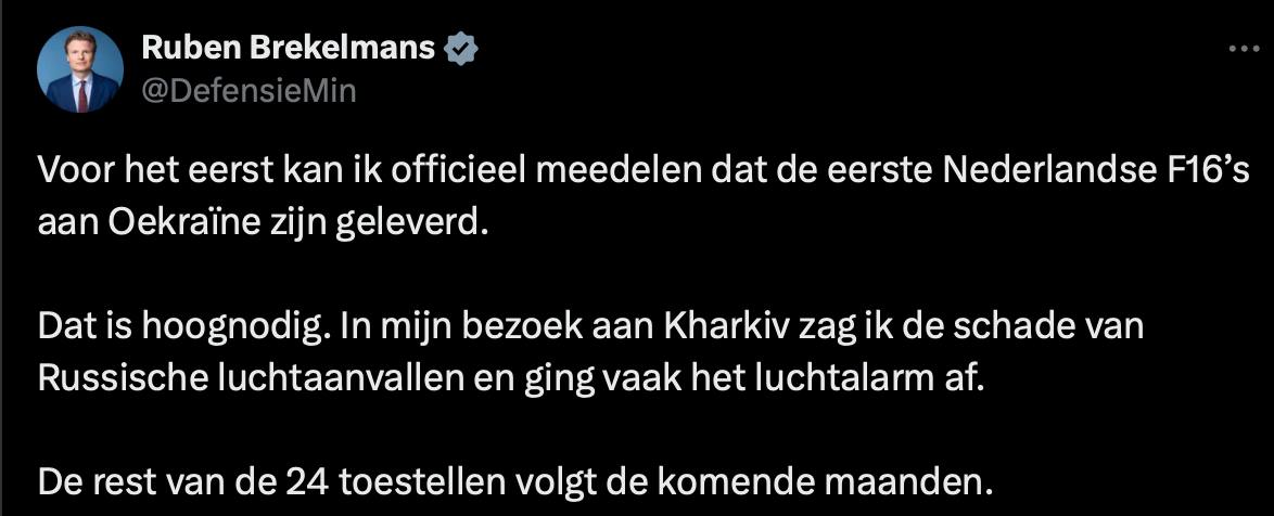 "Вперше можу офіційно заявити, що перших голландських F16 доставлено в Україну... Інші 24 літаки надійдуть найближчими місяцями", - повідомив Рубен Брекельман.