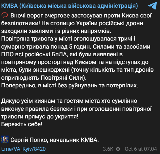 "Силами та засобами ППО всі російські БПЛА, виявлені в повітряному просторі над Києвом та на підступах до міста, були знешкоджені (точну кількість і тип дронів оприлюднять Повітряні Сили).
