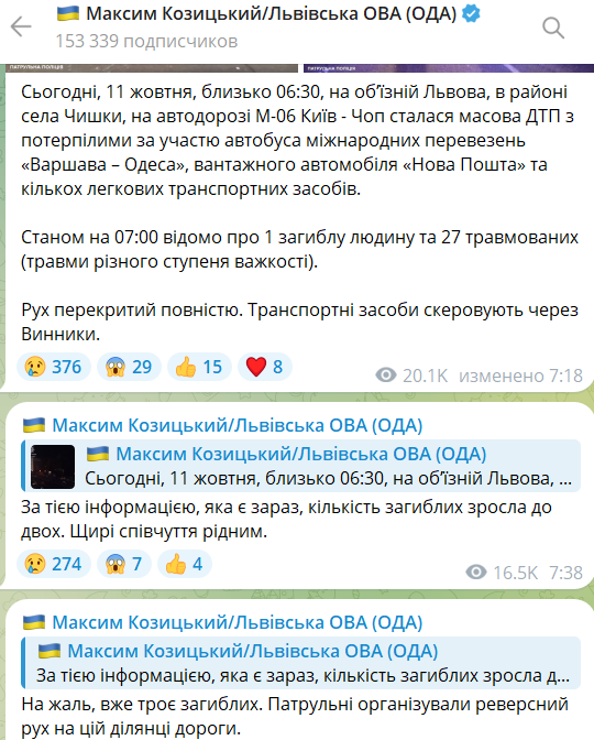"За попередніми даними, загинуло троє людей. Ще 35 мають травми різної тяжкості. Серед постраждалих є шестеро дітей. На місце ДТП виїжджали 11 бригад медиків. Потерпілим надається вся необхідна допомога. Обставини аварії з'ясовують правоохоронці", - йдеться у повідомленні.