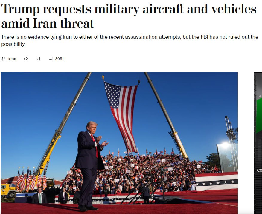 Дональд Трамп запросив військову авіацію, обмеження польотів над його будинками та місцями проведення мітингів, а також військову техніку для пересування через "загрозу з боку Ірану".