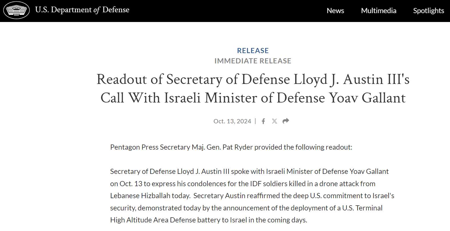При цьому Остін закликав до дипломатичного вирішення конфлікту з Ліваном, територія якого була атакована Ізраїлем напередодні.
