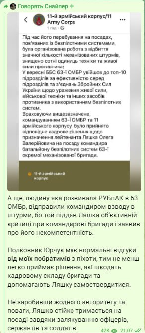 Крім того, за його словами, "людину, яка розвивала РУБпАК у 63-й ОМБр, відправили командиром взводу в штурми, тому що той зазнав Ляшка об'єктивної критики при командирі бригади і заявив про його некомпетентність".