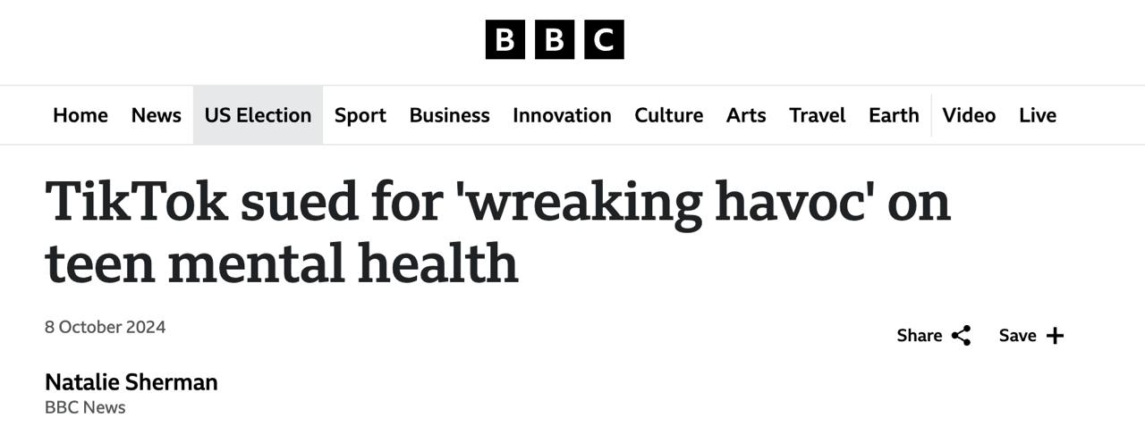 Генеральний прокурор Нью-Йорка Летиція Джеймс заявила, що молоді люди по всій країні загинули або отримали травми, виконуючи челенджі з TikTok, а багато інших відчували себе "сумними, тривожними і пригніченими" через функцію TikTok, що викликають звикання. Вона навела приклад 15-річного хлопчика, який загинув у Манхеттені під час "серфінгу в метро" - катання на даху вагона поїзда, що рухається. Пізніше його мати знайшла у його телефоні відео TikTok із подібними відео.