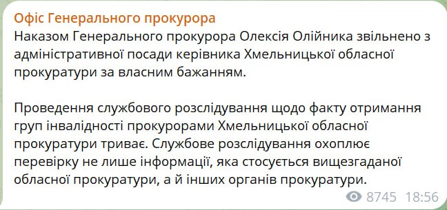 Також заявляється, що проводиться службове розслідування за фактом отримання груп інвалідності прокурорами Хмельницької облпрокуратури.