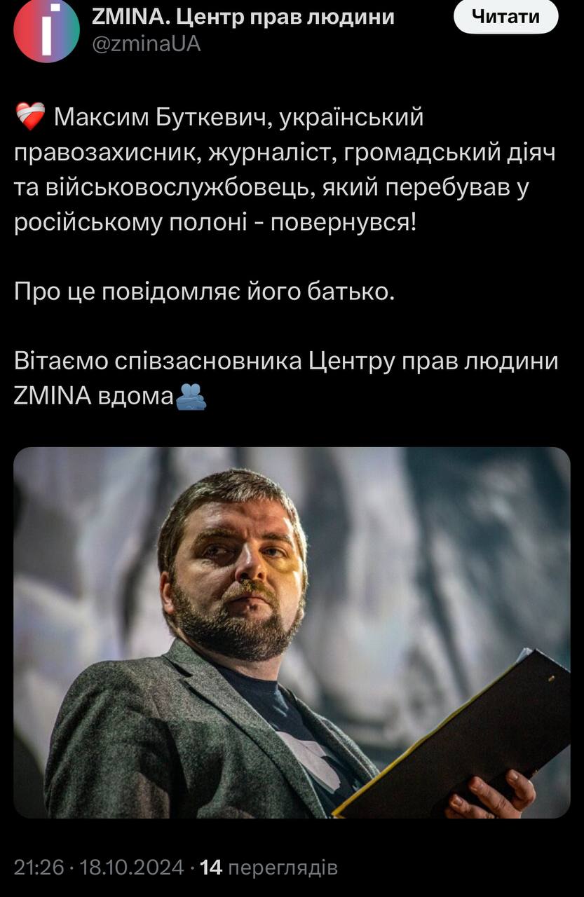 23.33 В рамках обміну в Україну повернули правозахисника, співзасновника Центру прав людини ZMINA Максима Буткевича, який служив у ЗСУ та потрапив у полон ще 2022 року.