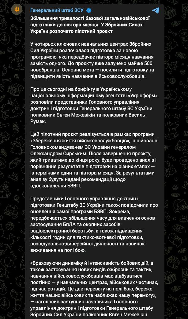 Тим часом, як повідомляє Генштаб, ЗСУ продовжили час навчання окремих мобілізованих із 30 днів до півтора місяця.