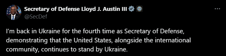 "Я повернувся в Україну вчетверте як міністр оборони, продемонструвавши, що Сполучені Штати разом з міжнародною спільнотою продовжують підтримувати Україну", - написав він у соцмережі Х.