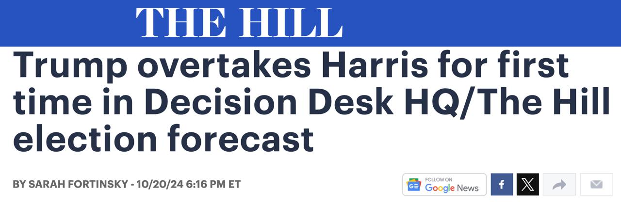 Він лідирує в 6 з 7 штатів, що вагаються, за їх результатами вирішуватиметься підсумок виборів. Тільки у Пенсільванії, рідному штаті нинішнього президента Джо Байдена, зараз більше шансів у Гарріс.
