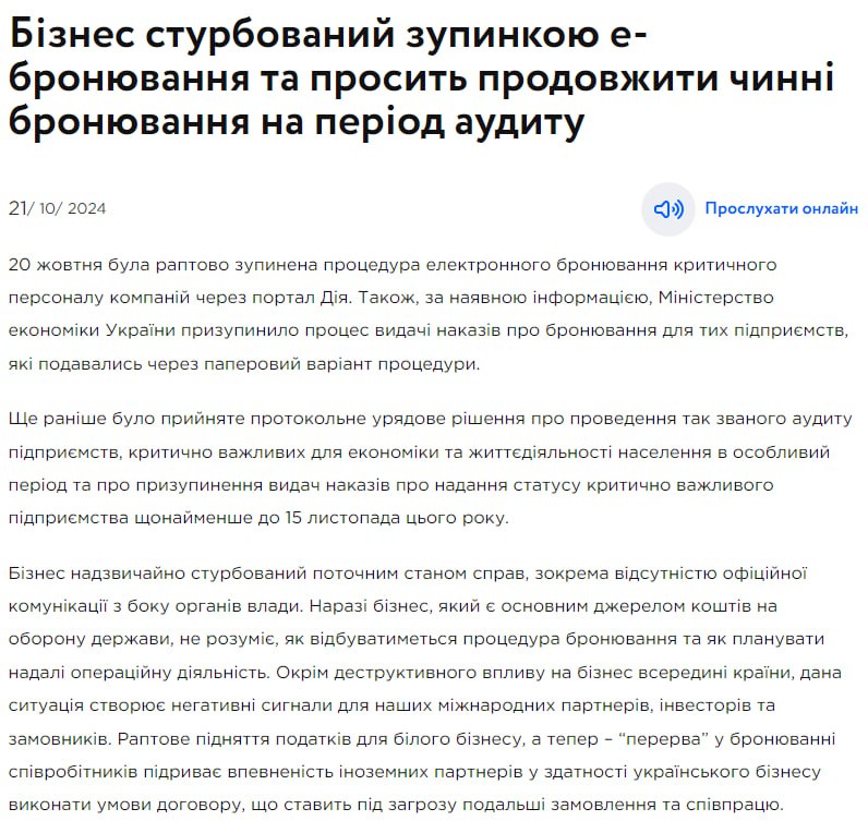 "Бізнес дуже стурбований поточним станом справ, у тому числі відсутністю офіційної комунікації з боку органів влади. Наразі бізнес, який є основним джерелом коштів на оборону держави, не розуміє, як проходитиме процедура бронювання і як плануватиме надалі операційну діяльність. Крім деструктивного. впливу на бізнес всередині країни ця ситуація створює негативні сигнали для наших міжнародних партнерів, інвесторів та замовників. та співробітництво. Також виникають питання легітимності зупинення процедури бронювання для проведення аудиту", - сказано в публікації.