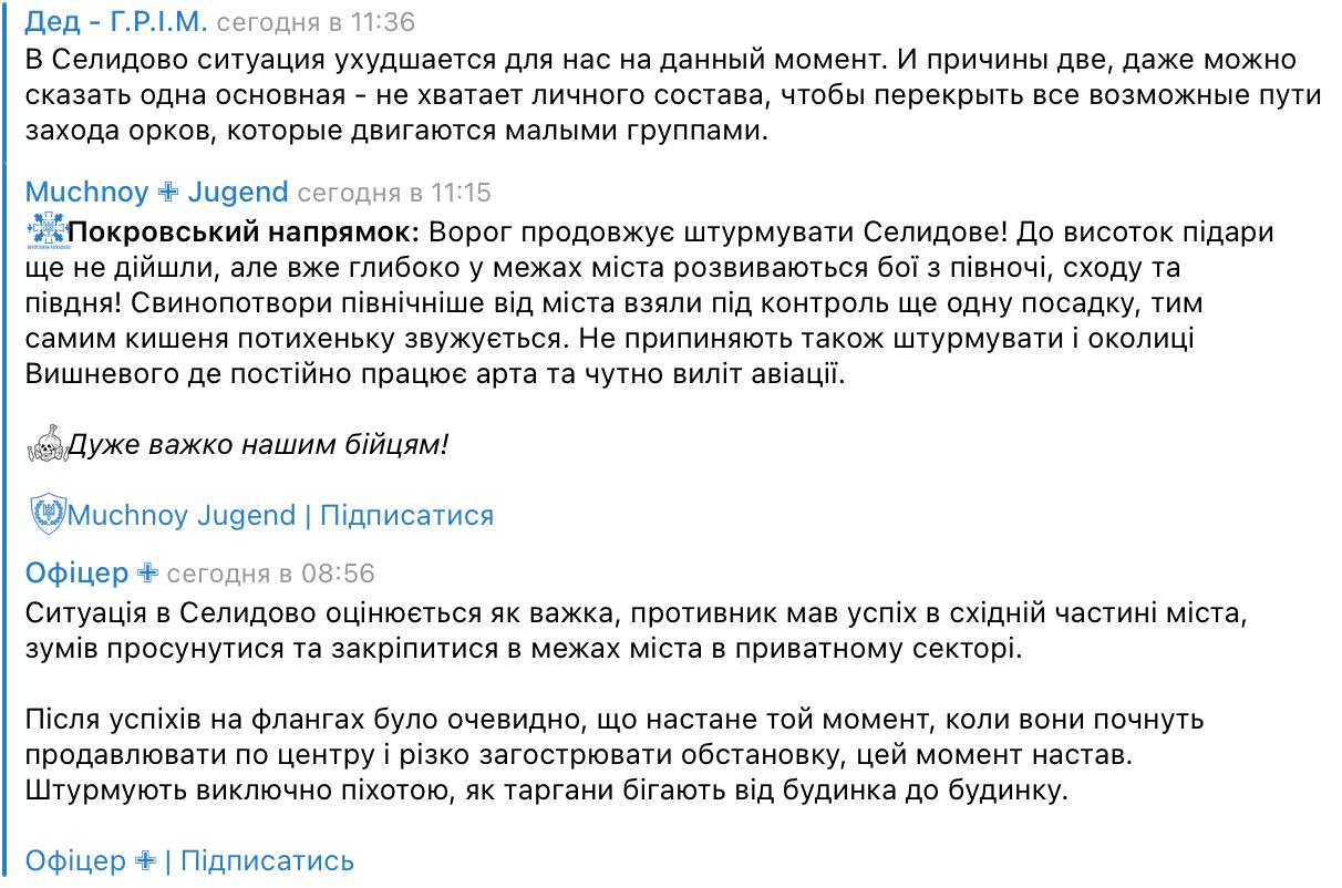 Лейтенант Алекс підтверджує, що росіяни зуміли закріпитися у приватному секторі у східній частині Селидово, йде наступ на центр міста. Цьому поступу сприяли їхні попередні успіхи на флангах.