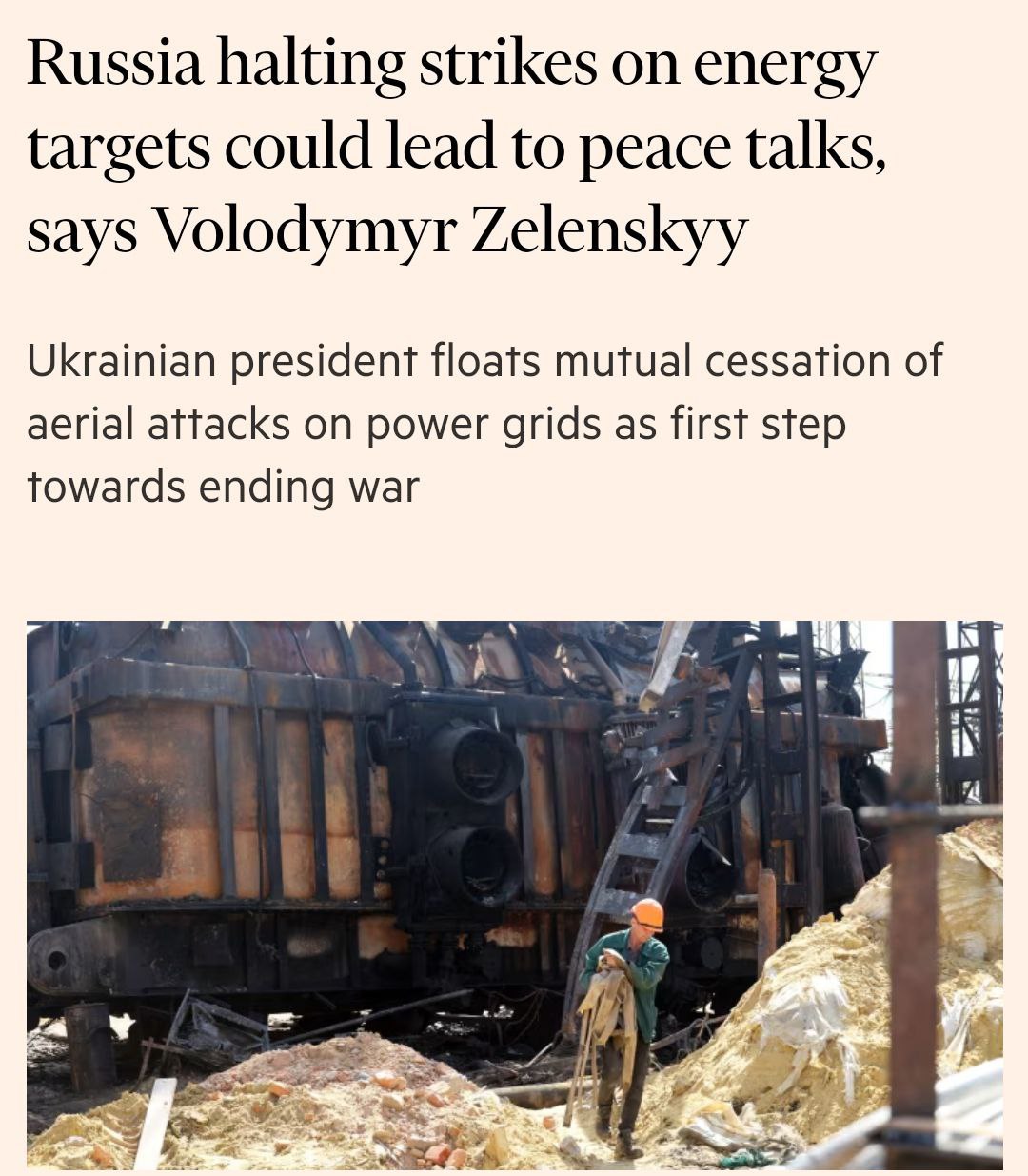 "Ми побачили під час першого (мирного) саміту, що може бути прийняте рішення щодо енергетичної безпеки. Іншими словами: ми не нападаємо на їхні енергетичні інфраструктури, вони не нападають на наші. Чи може це призвести до кінця гарячої фази війни? Я так думаю ", – цитує Зеленського FT.