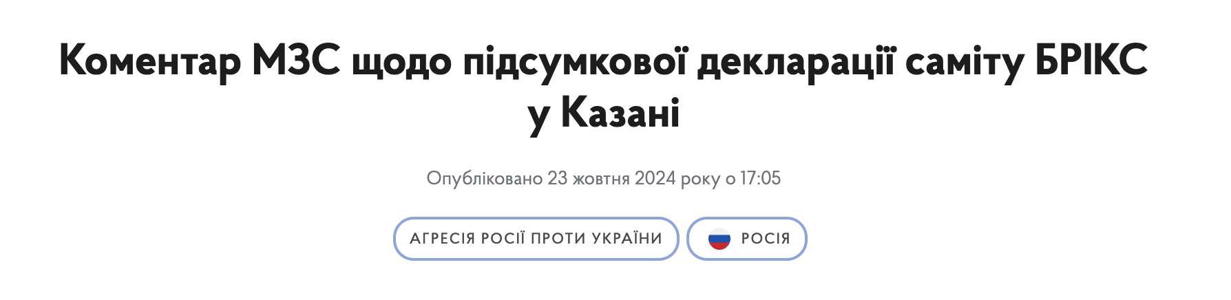 Українське МЗС відреагувало на декларацію саміту БРІКС, в якій одним із пунктів згадувалася Україна і йшлося про відданість дипломатичним шляхам мирного врегулювання війни.