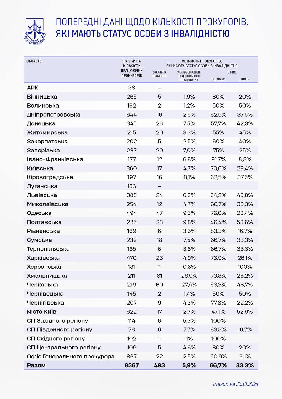 Високий відсоток прокурорів з інвалідністю виявлено у двох областях: йдеться не лише про Хмельницьку, а й про Черкаську.