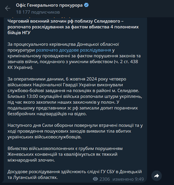 Офіс генерального прокурора заявляє про чергове вбивство українських військовополонених.