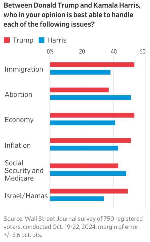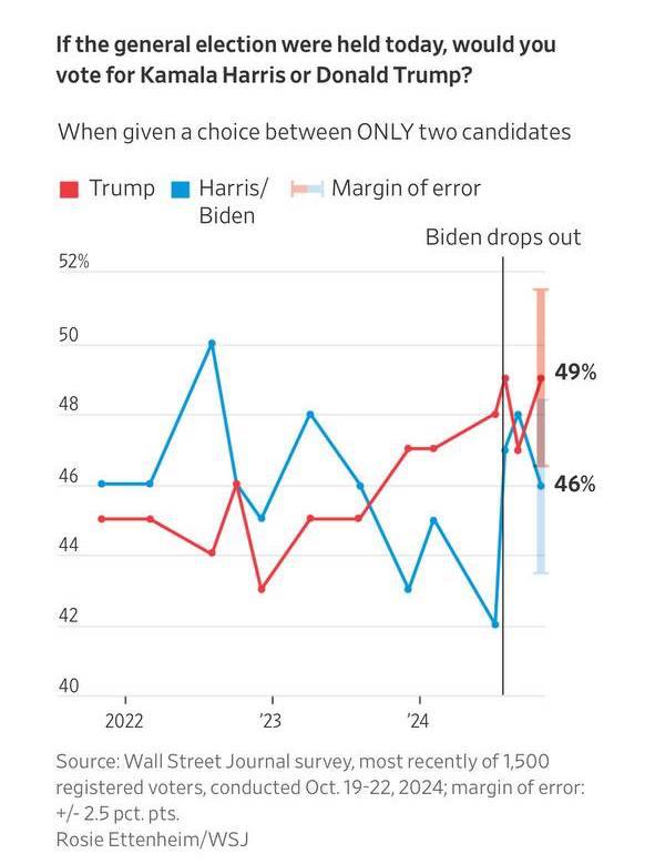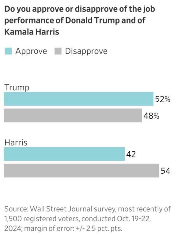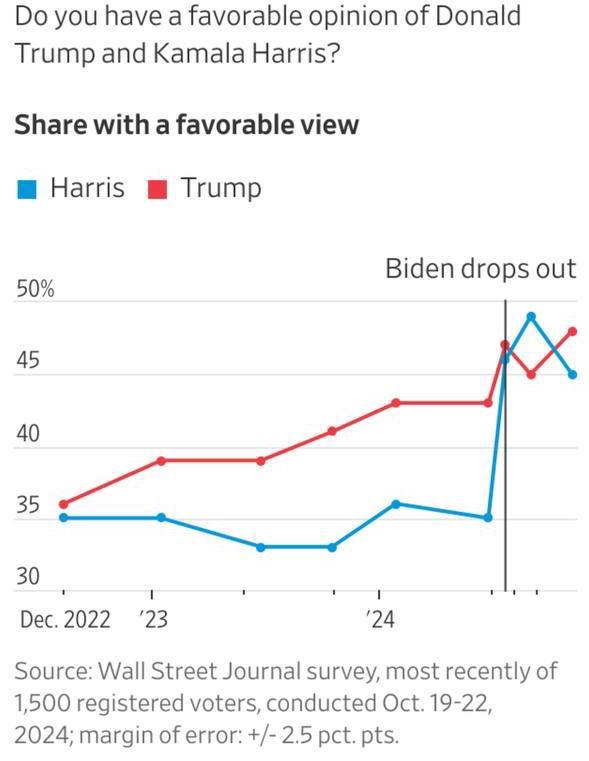 The Wall Street Journal робить висновок, що демократ отримав перевагу, тому що "виборці прийняли більш позитивний погляд на його програму та минулі досягнення та більш негативне ставлення до Камалі Харріс". Опитування показало, що "шквал негативної реклами та виступи самих кандидатів підірвали деякі позитивні враження про Харріс", які спочатку склалися у виборців.