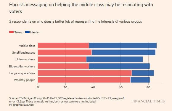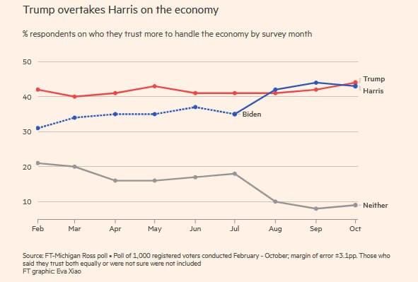 Опитування іншої газети, Financial Times, також показує, що Трамп випередив Харріс як кандидат, якому американці більше довіряють у питаннях економіки. Рейтинг Харріс з цього питання був вищим, ніж у Джо Байдена після номінації, і випереджав Трампа, проте на даний момент впав нижче, ніж у республіканця.